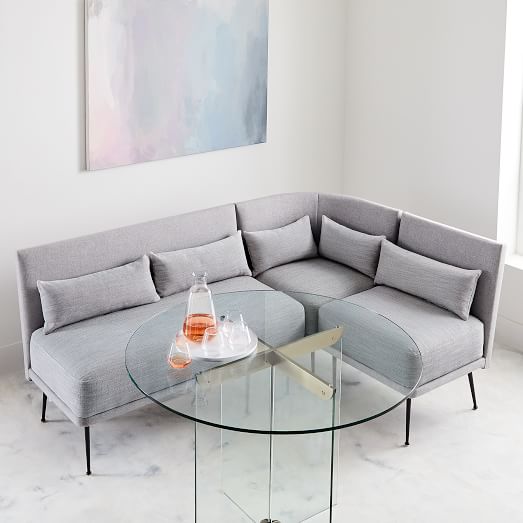 The tufted seat connects to an island, so company is always close to the chef. Banquettes come in all shapes and sizes, and they work with a variety of design styles. Carve out an inviting dining nook in any room with our deep, plush modern banquette, hand upholstered in your choice of fabrics so you can choose the one that's right for you. Riverbay furniture patio conversation kitchen breakfast corner nook table booth bench dining set in white. This clever kitchen design features an armless sofa as banquette with a table where many others would have used bar stools.
