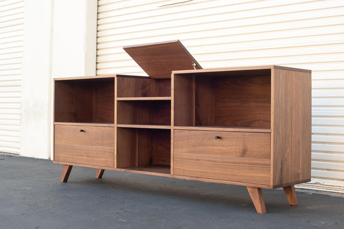 Handsome american walnut veneer and characteristic black detailing balance confidence with mature subtlety. Mid century teak rolling record storage media consoleconsole measures: Two interior shelves adjust to fit all of your gear, and hidden cutouts in the back hide a tangle of cords. Mash studios lax series entertainment shelf $1,198.00. Fitted with drawers and a spacious cabinet with a shelf and wire cutouts, it has room for books, media and more. 80w x 19d x 27h. Sure to be a conversation starter, our console was designed around that most classic of media components, the record player. Shop for mid century modern media console at bed bath & beyond. 5 out of 5 stars. Acorn (a lighter more natural and transparent finish), dark mineral (a dark brown which still shows grain), and white (paint, grain is still visible). Fitted with drawers, a cabinet with a shelf and wire cutouts, it has room for books, media and more. Mid century record console stand double decker modern media console. That is why the mid century modern tv stands are in high demand.